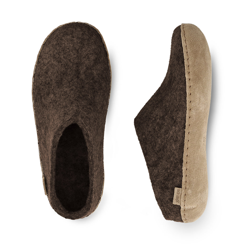 Our slip-ons are made of 100% pure, natural wool in the classic colour nature brown with a sole of soft and chrome-free calfskin.